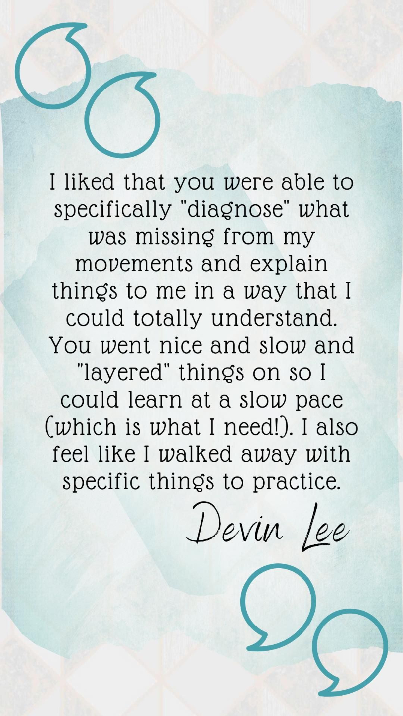 "I liked that you were able to specifically “diagnose” what was missing from my movements and explain things to me in a way that I could totally understand. You went nice and slow and “layered” things on so I could learn at a slow pace (which is what I need!). I also feel like I walked away with specific things to practice."
