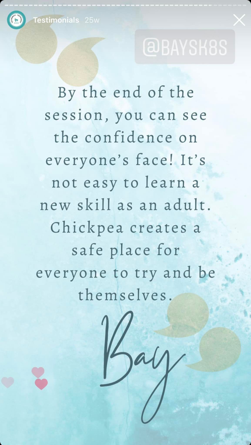 "By the end of the session, you can see the confidence on everyone's face! It's not easy to learn roller skating as an adult. Chickpea creates a safe place for everyone to try and be themselves"