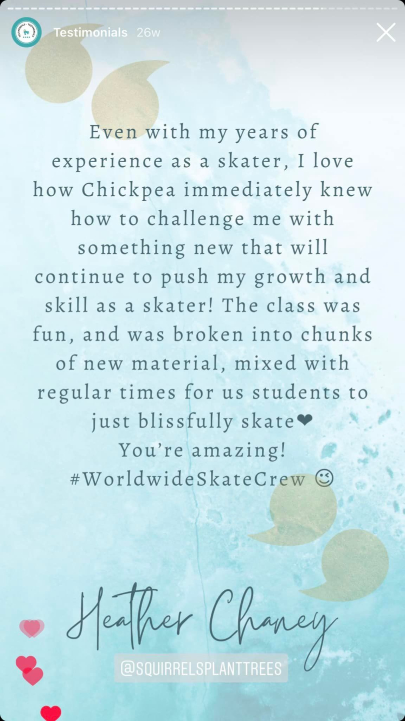 "Even with my years of experience as a skater, I love how Chickpea immediately knew how to challenge me with something new that will continue to push my growth and skill as a skater! The class was fun, and was broken into chuncks of new material, mixed with reagular times for us students to just blissfully skate. You're amazing."