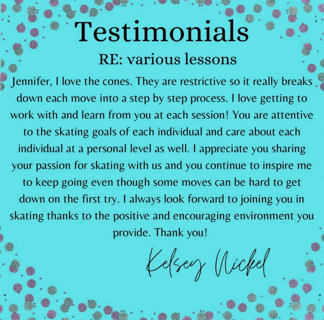 "Jennifer, I love the cones. They are restrictive so it really breaks down each move into a step by step process. I love getting to work with and learn from you at each session! You are attentive to the skating goals of each individual and care about each individual at a personal level as well. I appreciate you sharing your passion for skating with us and you continue to inspire me to keep going even though some moves can be hard to get down on the first try. I always look forward to joining you in skating thanks to the positive and encouraging environment you provide. Thank you!"
